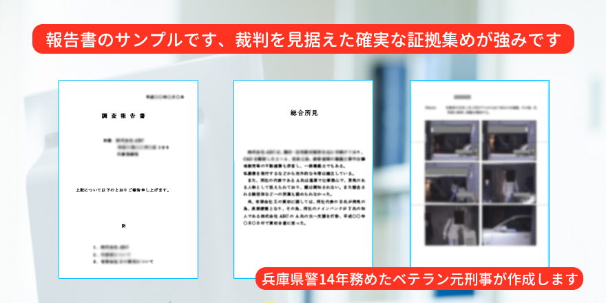 こういった調査には証拠能力の高い報告書が重要です。ラビット探偵事務所には元兵庫県警察官が所属しており、裁判にも通用する証拠能力の高い報告書を作成いたします。